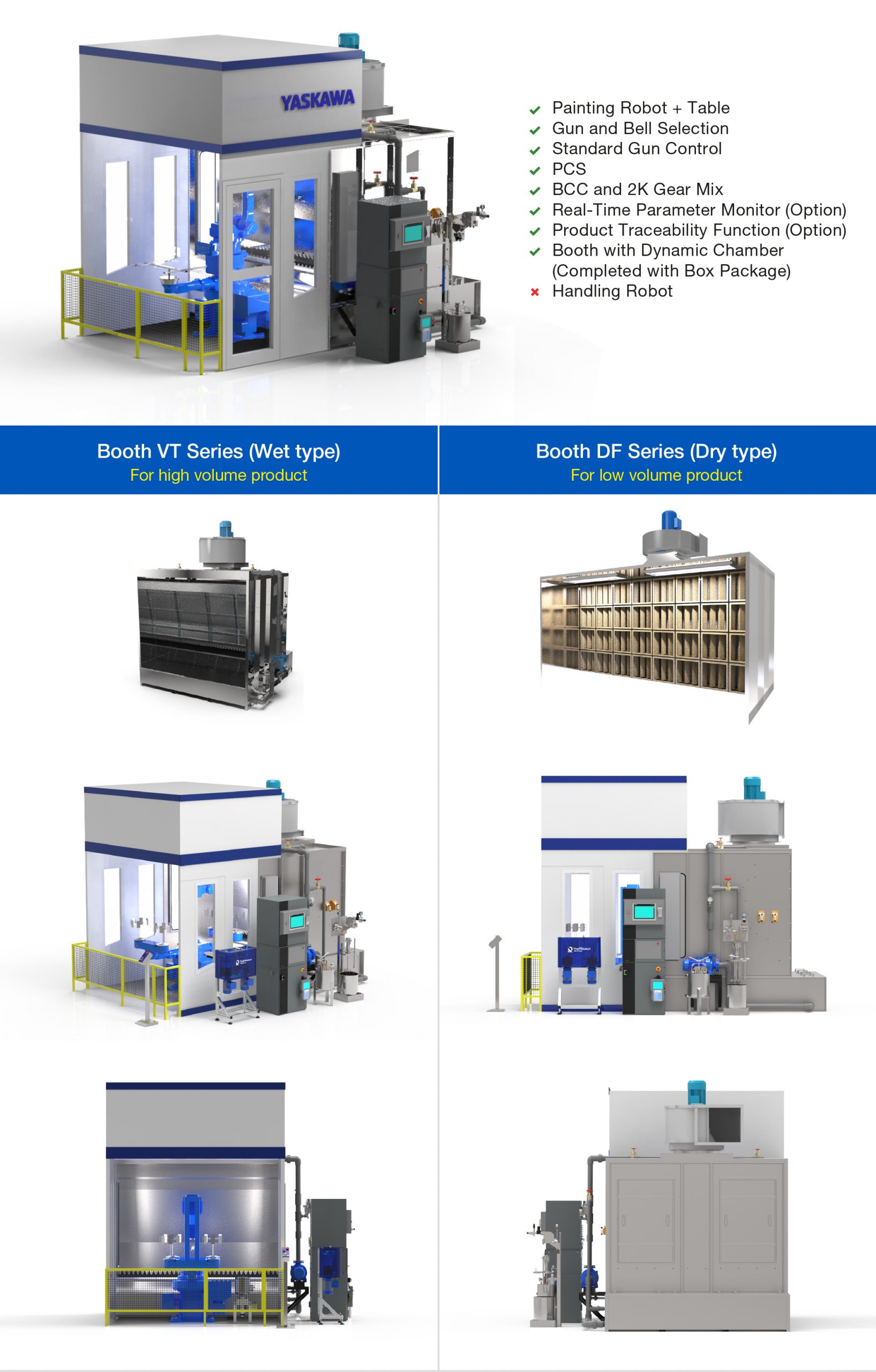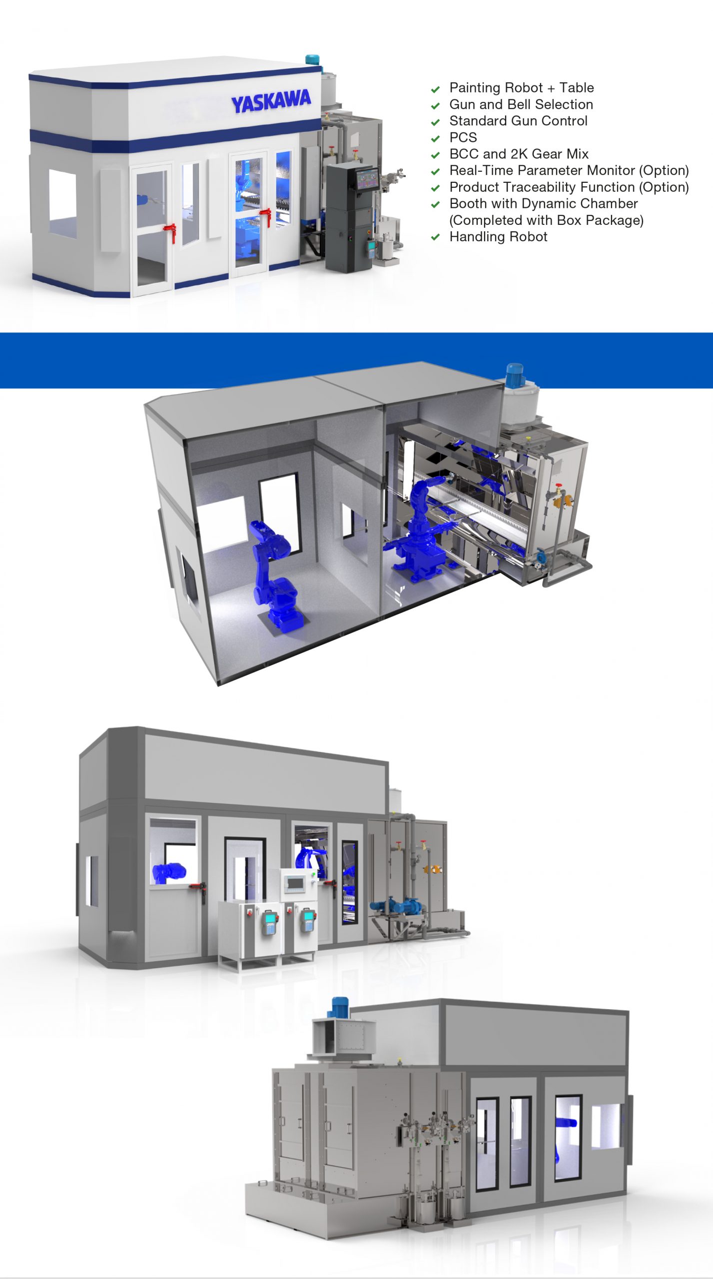 YASKAWA menawarkan rangkaian paket sistem pengecatan yang beragam untuk memenuhi kebutuhan spesifik Anda. Rangkaian ini berkisar dari paket MOTOFEEDER yang dioptimalkan untuk mengecat benda kerja kecil hingga sistem pengecatan untuk panel dalam dan luar mobil dan benda kerja ekstra besar seperti gerbong kereta dan peralatan konstruksi. Kami dapat mengusulkan paket sistem pengecatan yang dioptimalkan untuk ukuran benda kerja Anda, ruang pemasangan, dan persyaratan khusus lainnya.